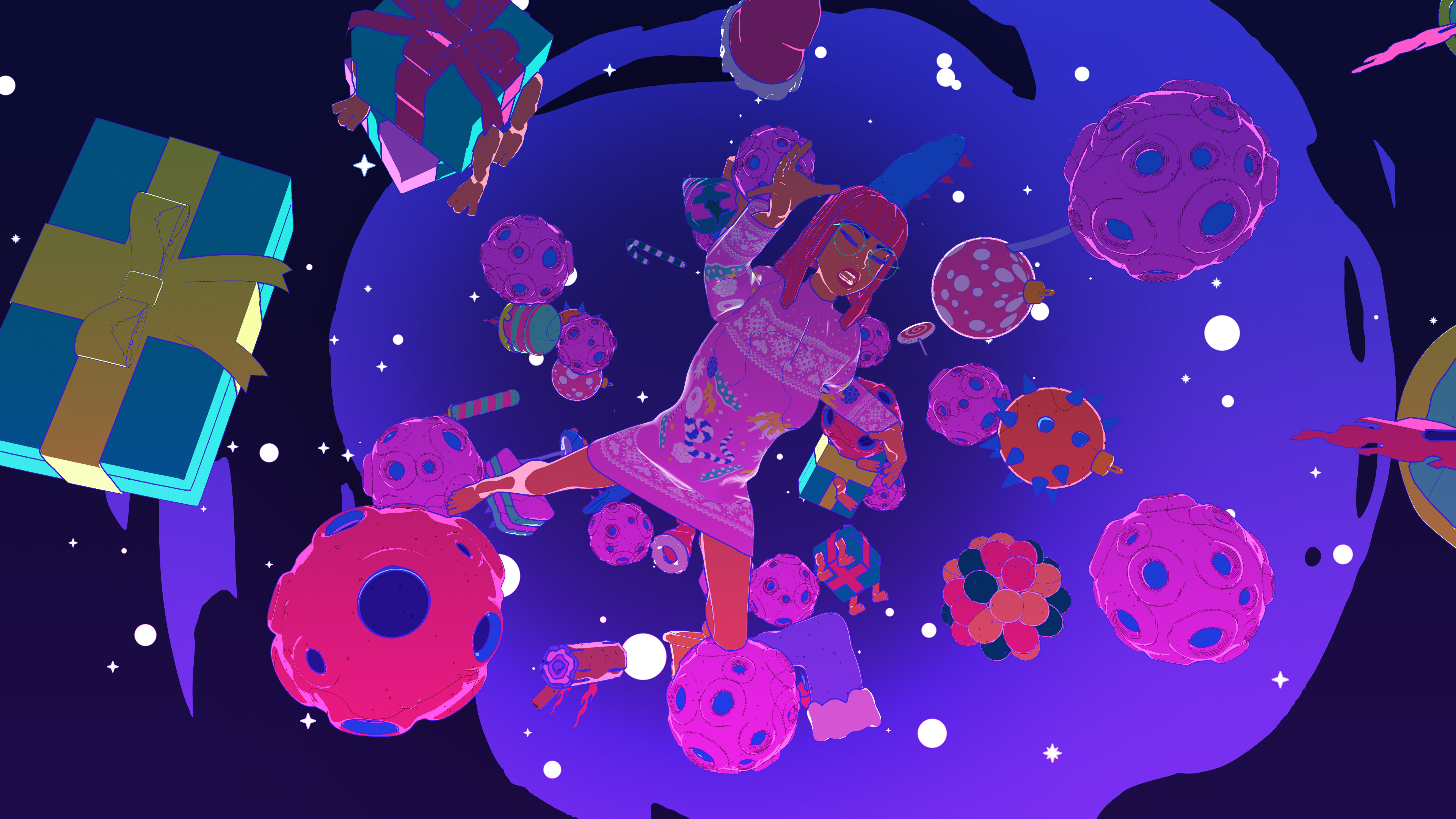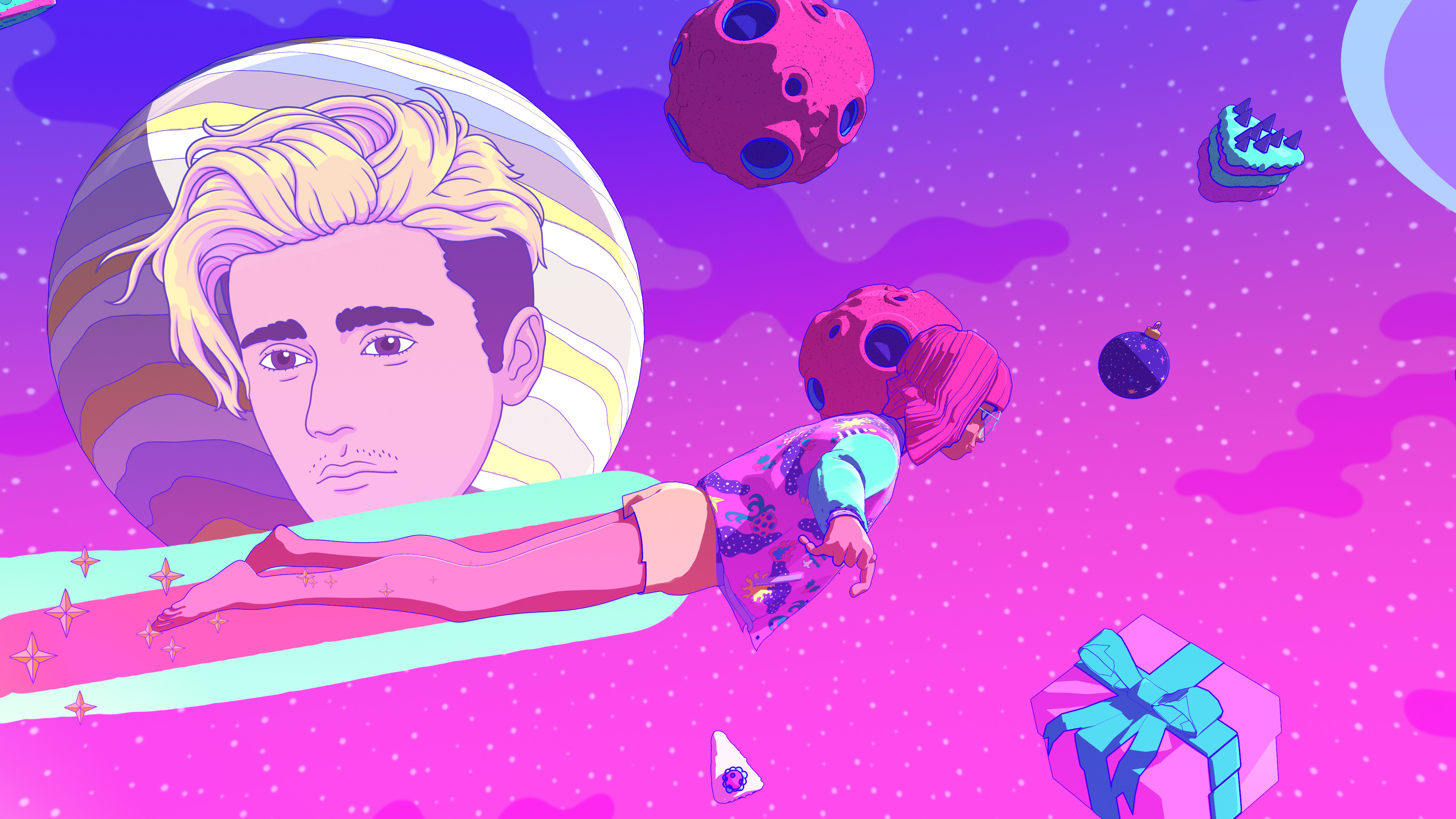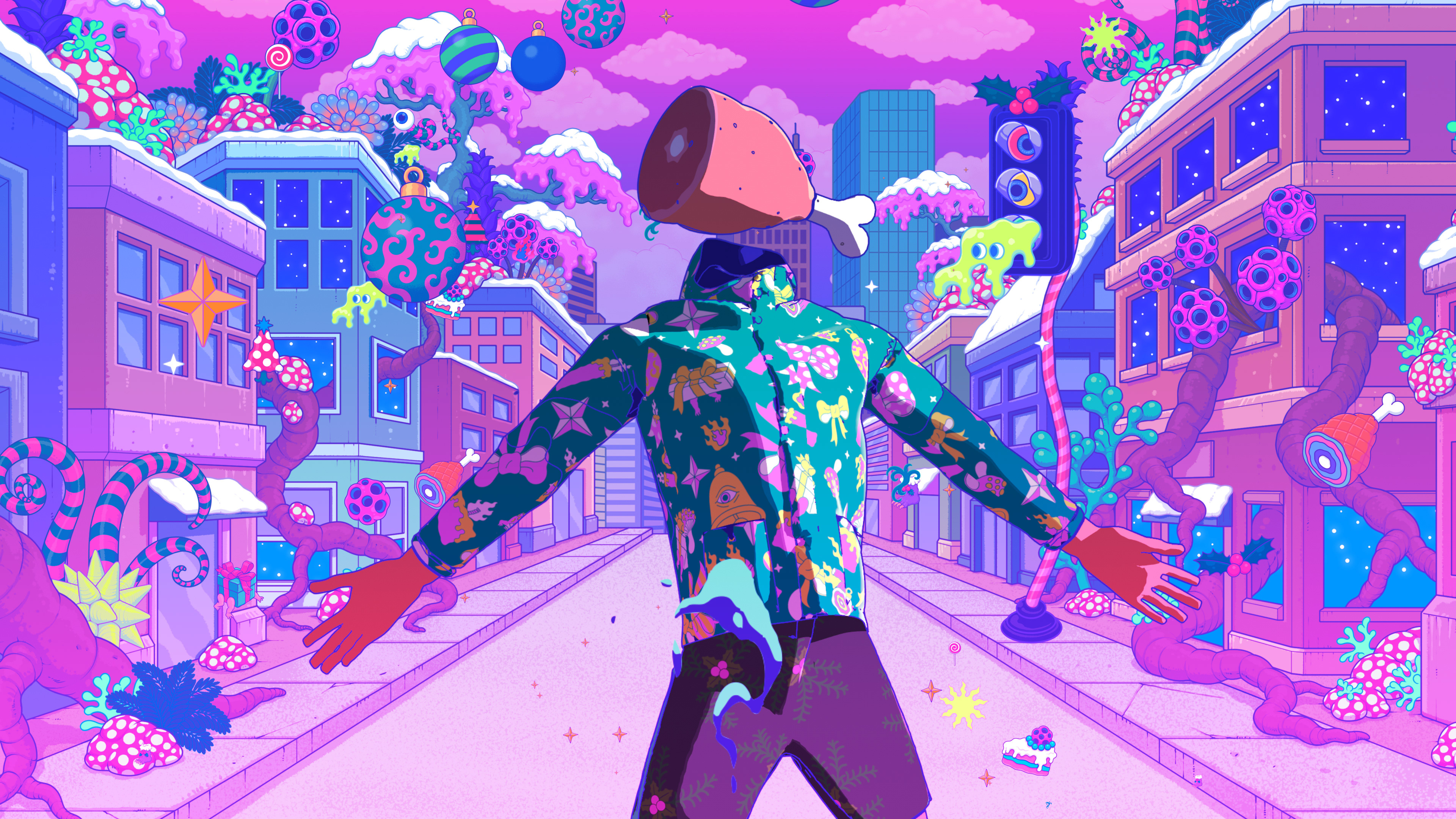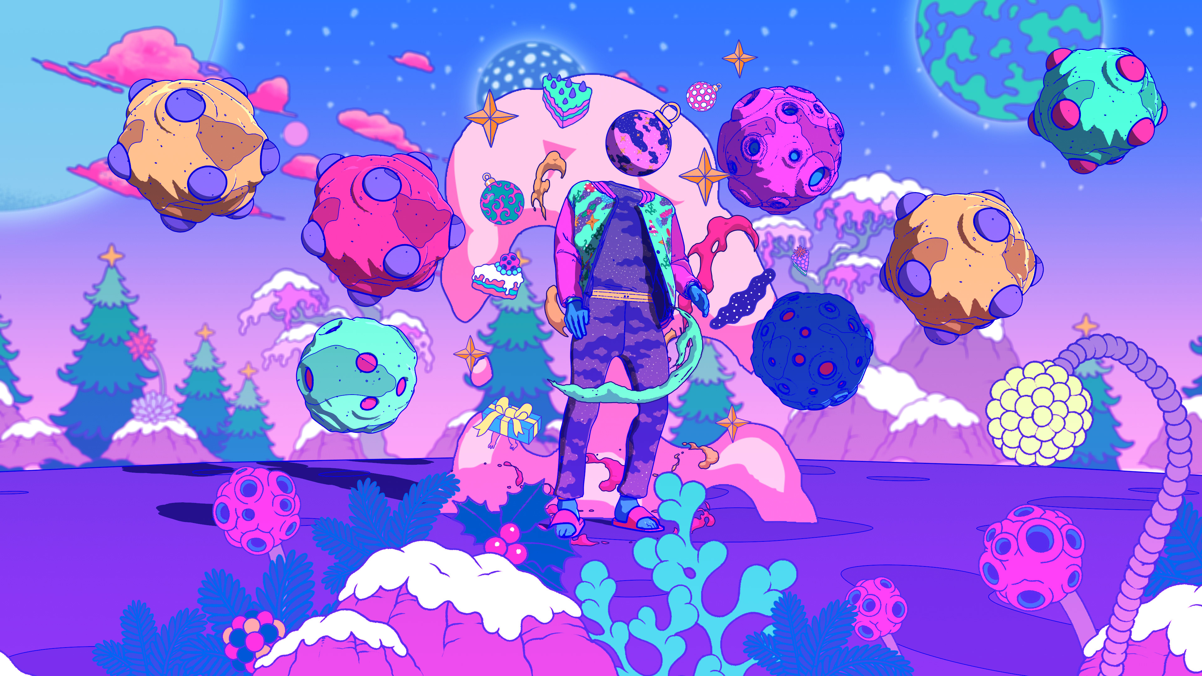 I collaborated with legendary South Korean artist Bang Sangho on this one. He is famous for creating detailed alien landscapes, surreal and highly imaginative. So naturally we came up with an inter-dimensional Christmas realm full of walking presents, floating hams, a celestial being who drops festive bombs on the world, a robot Justin and a mystical Christmas Wizard who creates all the presents in the world out of a black hole in his stomach. Yes, I have no idea how they approved it either!