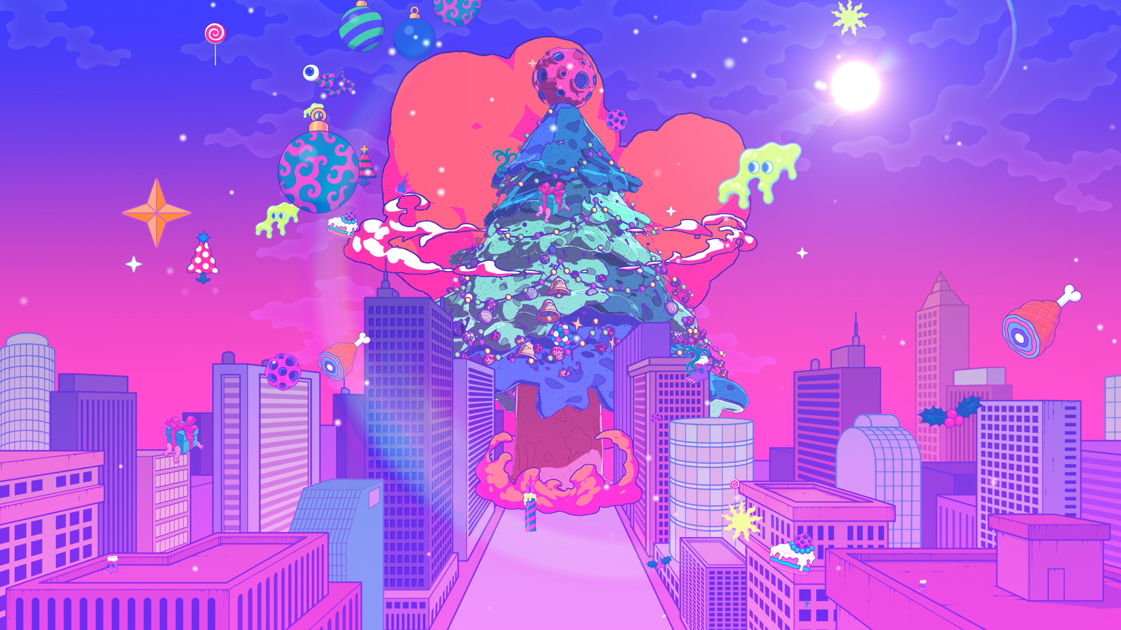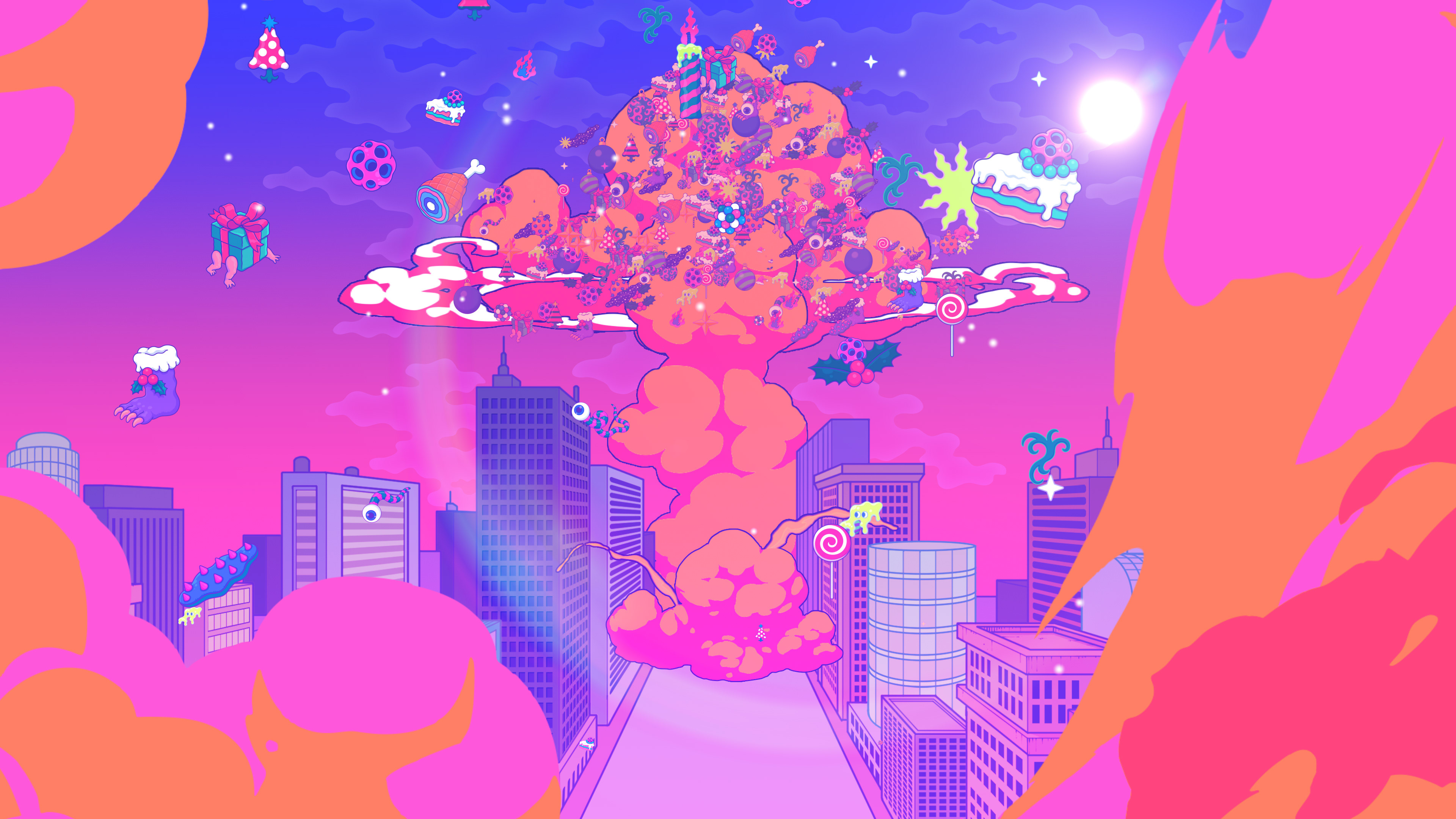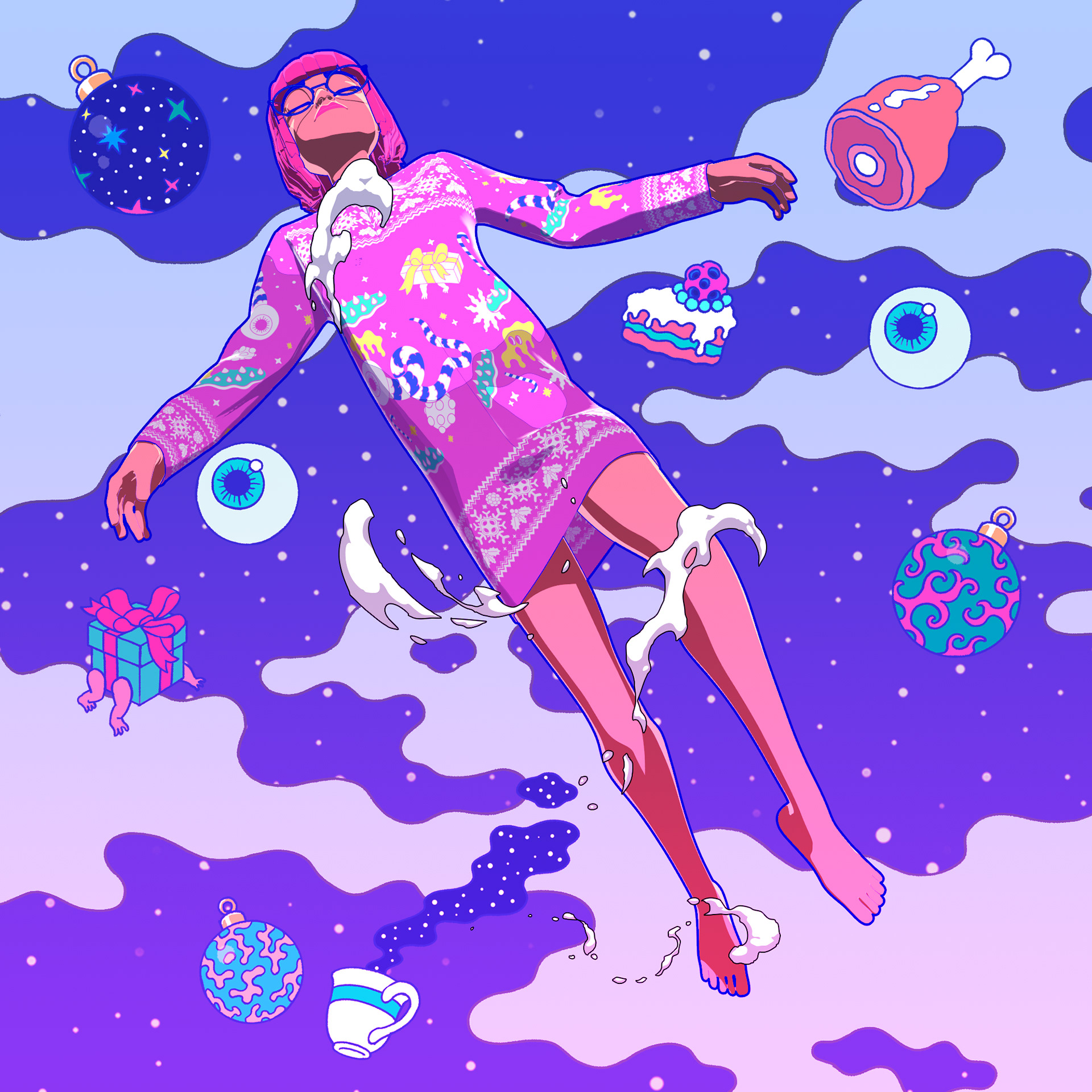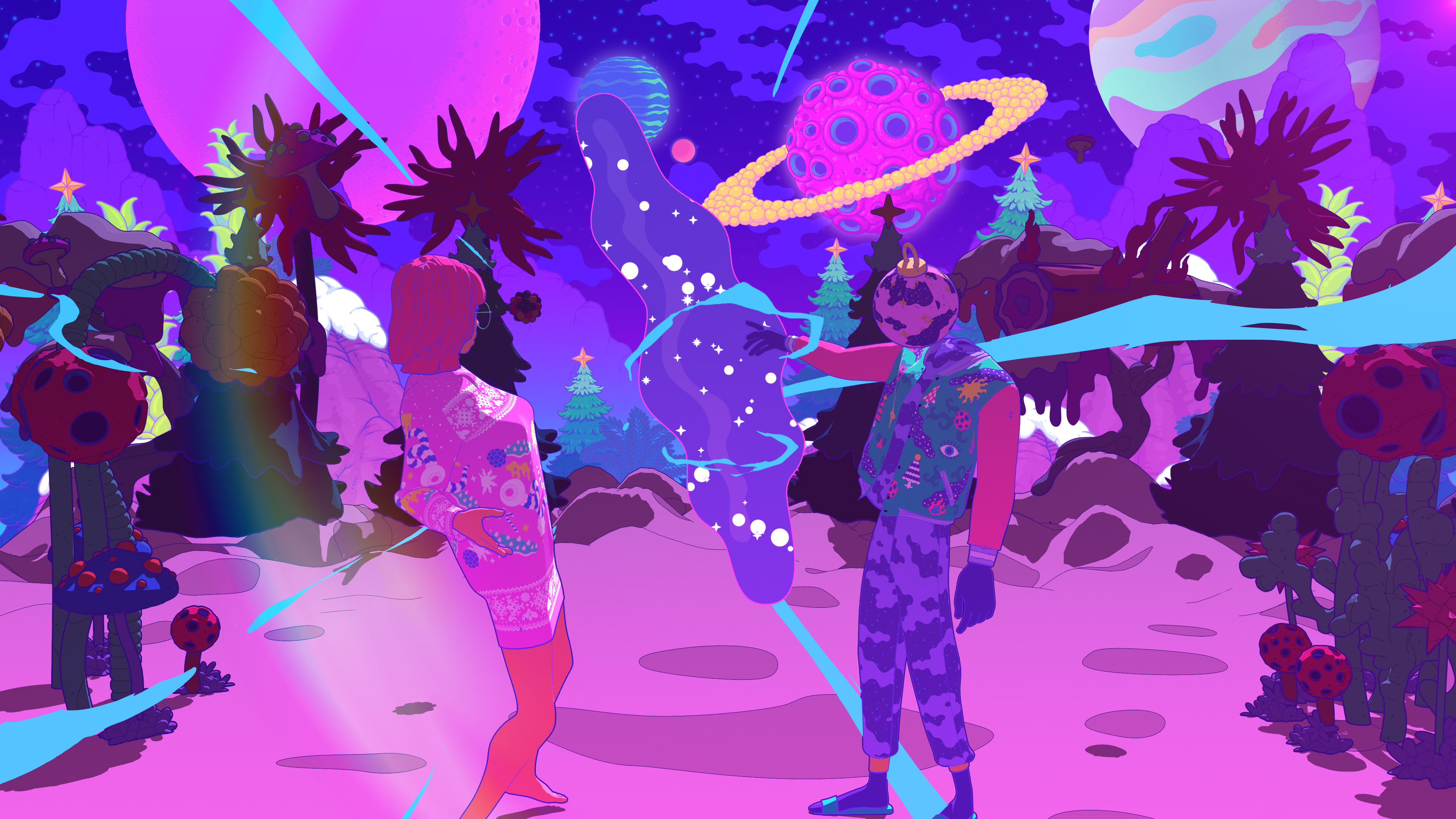 I collaborated with legendary South Korean artist Bang Sangho on this one. He is famous for creating detailed alien landscapes, surreal and highly imaginative. So naturally we came up with an inter-dimensional Christmas realm full of walking presents, floating hams, a celestial being who drops festive bombs on the world, a robot Justin and a mystical Christmas Wizard who creates all the presents in the world out of a black hole in his stomach. Yes, I have no idea how they approved it either!